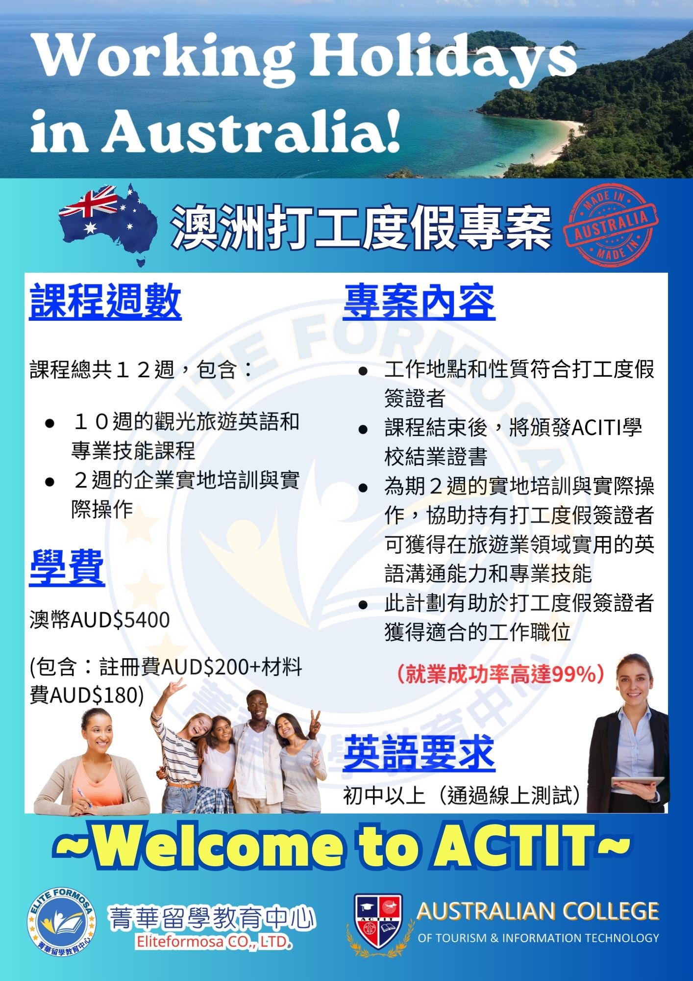 澳洲旅遊與資訊科技學院 (ACTIT) 是澳洲註冊培訓組織 (RTO),根據澳洲資格架構 (AQF) 提供國家認可的資格培訓, ACTIT 也是聯邦海外學生機構和課程登記處 (CRICOS) 的註冊提供者,為國際學生提供教育服務。ACTIT 專門提供旅遊、活動、飯店、資訊科技和社區服務產業的培訓。我們的管理團隊和教學人員都是高素質的行業專家,並與業界保持密切的專業聯繫,以確保我們的培訓處於行業發展的前沿。ACTIT 以其強大的行業聯繫和雇主關係而聞名,為學生提供寶貴的實習機會和獎學金;我們也擁有通往澳洲著名大學的教育途徑,從而確保我們的學生成功的教育和職業成果。透過 ACTIT 學習、發展並取得成功!